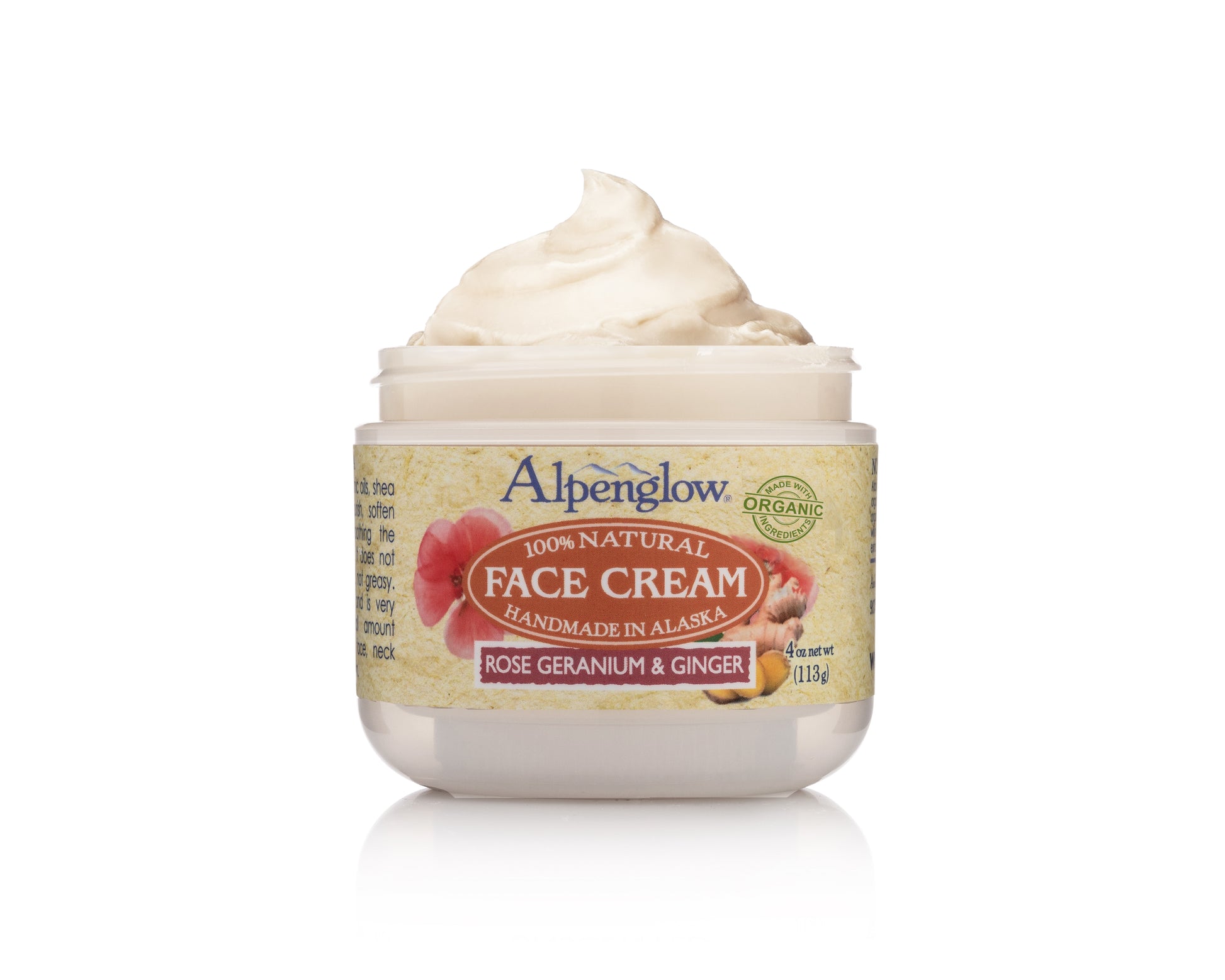 Pristine Alaskan water, organic jojoba oil, organic sunflower oil, organic apricot kernel oil, pure beeswax, vegetable emulsifying wax, organic virgin rose hip oil, organic unrefined fair-trade shea butter, willow bark extract, Leucidal (natural preservative), rose geranium and ginger essential oils, rosemary extract (natural antioxidant), sodium borate (natural emulsifier).